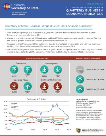 Q3 2025 Colorado Secretary of State Q3 2025 Indicators Report New entity filings in Q3 2025 increased 7.2% year-over-year but decreased 12.9% quarter-over-quarter following an exceptionally strong Q2. More